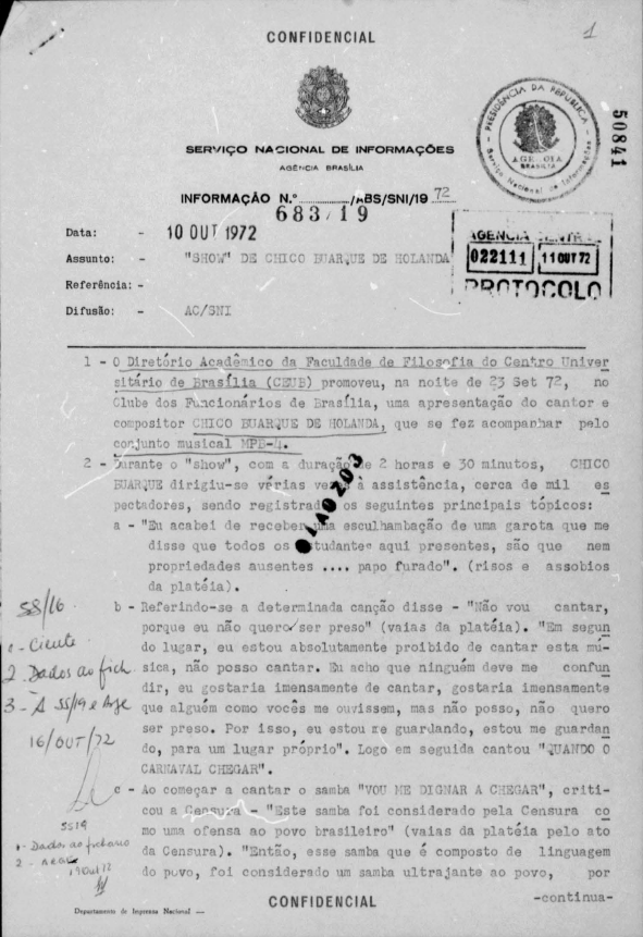 O Informe 638/19/ABS/SNI/1972, produzido pela Agência Brasília do SNI, disponível no Arquivo Nacional, mostra o show de Chico no Ceub, faculdade privada de Brasília, em 23 de setembro de 1972. Classificado como confidencial, e contendo nove páginas, o relatório produzido em 10 de outubro de 1972, trata do show de Chico produzido pelo Diretório Acadêmico da Faculdade de Filosofia do Ceub, no Clube dos Funcionários de Brasília.