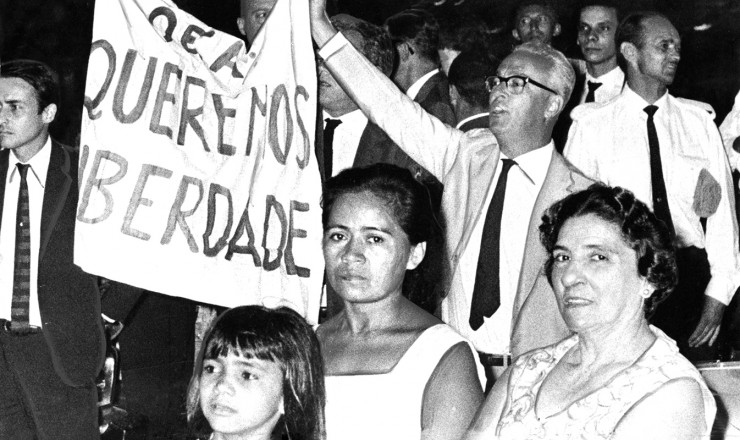 Intelectuais promovem uma manifestação contra a ditadura em frente ao Hotel Glória, no Rio de Janeiro. No local, realizava-se uma conferência da Organização dos Estados Americanos (OEA) com a presença do general presidente Castelo Branco.