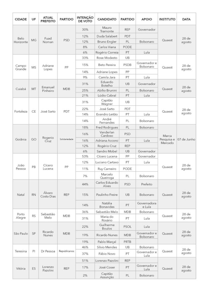 Além destas capitais citadas com o PT na cabeça de chapa, tem-se também outras onde o candidato apoiado pelo Presidente Lula está à frente, segundo as últimas publicações. No Rio de Janeiro, o atual prefeito do PSD Eduardo Paes deve se reeleger (com chances ainda no primeiro turno). Possui 60% da intenção de voto segundo a Quaest. Mesma situação em Recife, onde João Campos do PSB possui 80% da intenção de voto, segundo o mesmo instituto.
