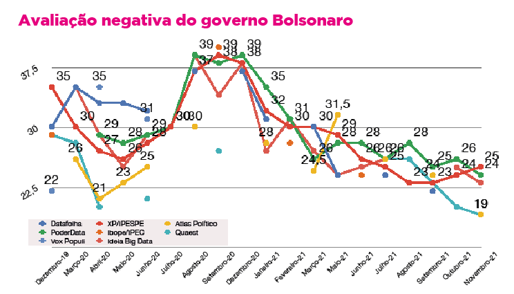 Os dois levantamentos mais recentes, com os cenários das eleições presidenciais divulgados pelos institutos Ipespe e Atlas Político, divergem em relação à aprovação do governo Bolsonaro. Enquanto o primeiro traz um patamar estável nas últimas três rodadas entre 23% e 25% — um quarto da população — a pesquisa Atlas confirma o levantamento mais recente do Quaest. A aprovação do governo federal teria caído para menos de 20% dos brasileiros, chegando a 19% — uma queda de 7 pontos percentuais desde julho de 2021).
