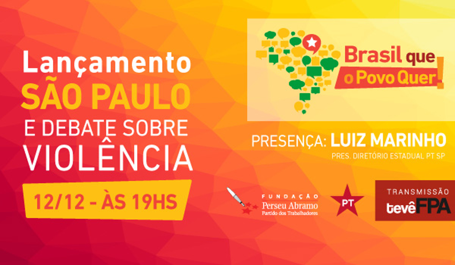 No dia 12 de dezembro acontecerá o lançamento da plataforma Brasil que o Povo Quer em São Paulo, em Heliópolis. Estão confirmadas as presenças de Luiz Marinho, presidente Diretório Estadual SP, Rafael Outono, coordenador pedagógico dos projetos da União de Núcleo e Associação de Moradores de Heliópolis e região (Unas) e movimento de juventude, Lídia Tavares, coordenadora do movimento de mulheres de Heliópolis, Maria Antônia, educadora e coordenadora do movimento de combate ao racismo, e Gerohannah Barbosa de Souza, do Centro de Cidadania LGBT.