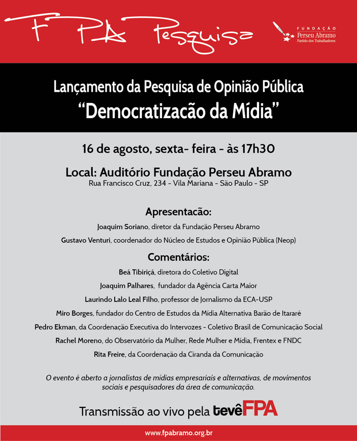 A Fundação Perseu Abramo (FPA) lança nesta sexta-feira, 16, a partir das 17h30, a...
