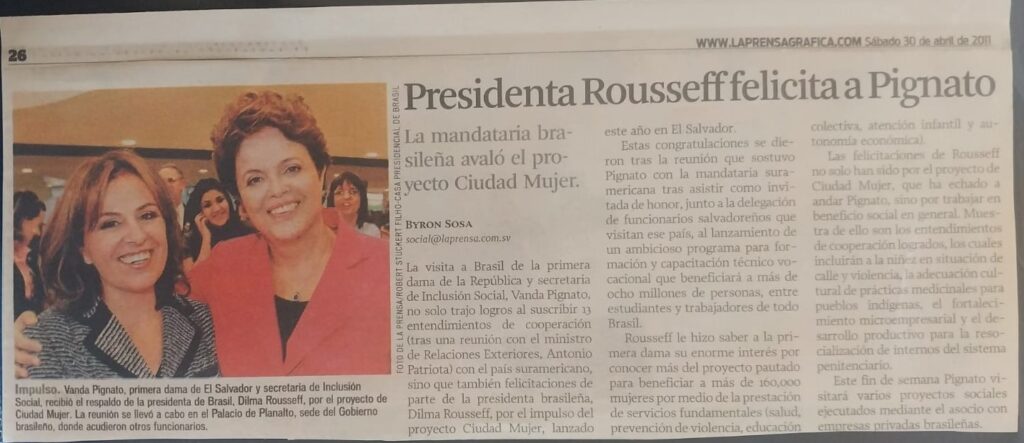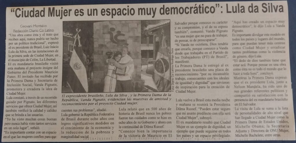Em setembro de 2011, a CM recebeu a visita do presidente Lula. Foi uma visita cheia de emoções. O presidente Lula em seu discurso disse: “CM é um espaço muito democrático. Tenho visto muitas coisas boas, mas nunca tinha visto tantos serviços no mesmo lugar.” Foi nessa visita que o presidente me disse que conversaria com a presidenta Dilma para que pudesse conhecer a experiência do CM e assim foi. A presidente Dilma enviou uma delegação a El Salvador para conhecer nosso projeto e a partir dai deu início a Casa da Mulher Brasileira, que tem realizado um excelente trabalho. O modelo CM está disponível para ser adequado a qualquer realidade. Basta vontade política e ter compromisso com a luta pela igualdade.