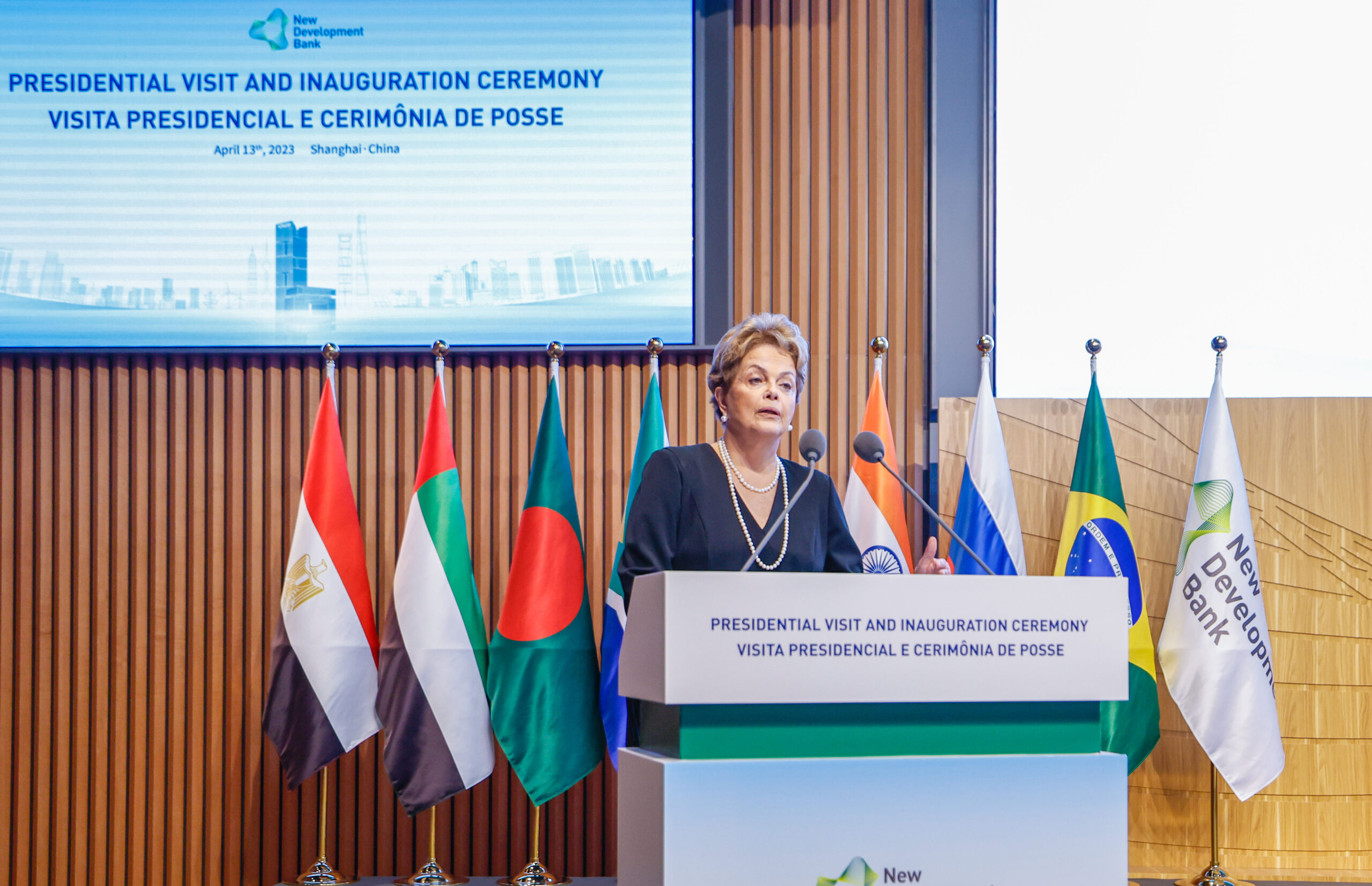 No discurso feito diante do presidente Luiz Inácio Lula da Silva, e de autoridades da China e do Braisl, Dilma defendeu que o NDB dê prioridade às ações de combate à pobreza e às desigualdades sociais, usando moedas locais para novos projetos de investimento. Ela declarou que a inclusão e a desigualdade precisam ser enfrentados e superados pelos países integrantes do Brics — Brasil, Rússia, Índia, China e África do Sul.