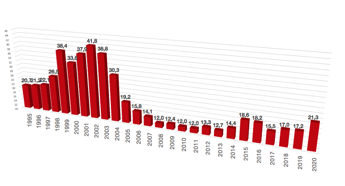 Isso também se percebe no comportamento da dívida externa bruta que, em 2020, atingiu 21,3% do PIB, quase o dobro do patamar verificado em 2011.