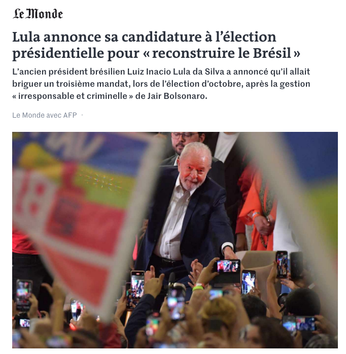 No outro famoso jornal parisiense, o Le Monde, a pré-candidatura de Lula também ganhou destaque, inclusive na capa do jornal de segunda, 9. Lula anuncia sua candidatura às eleições presidenciais para “reconstruir o Brasil” — diz a manchete. O jornal informa que o petista anunciou que concorrerá a um terceiro mandato nas eleições de outubro após a gestão “irresponsável e criminosa” de Bolsonaro.