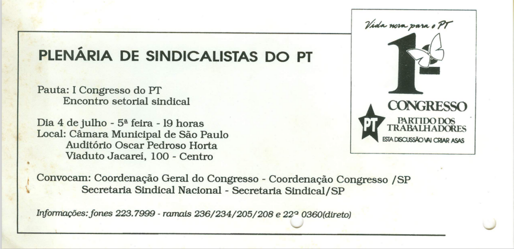 Os documentos abaixo estão disponíveis no acervo do Centro Sérgio Buarque de Holanda – Documentação e Memória Política. Foram digitalizados para compor uma amostragem do que temos para consulta em nosso acervo físico da Secretaria Sindical Nacional do Partido dos Trabalhadores.