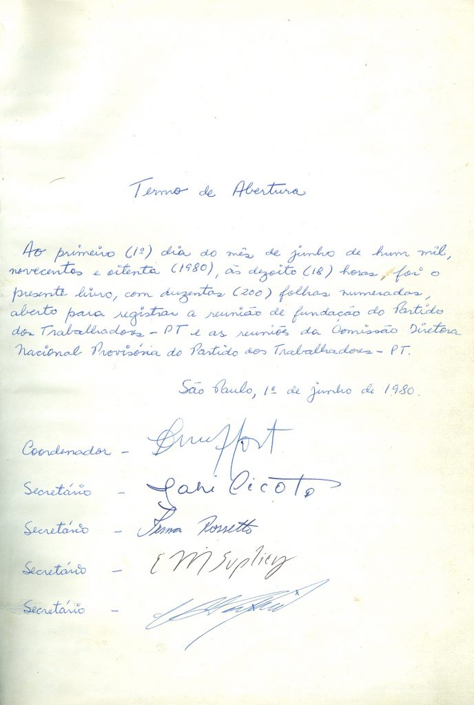 Termo de abertura da reunião de fundação do PT, São Paulo-SP, 01 de junho de 1980. Acervo: CSBH/FPA.