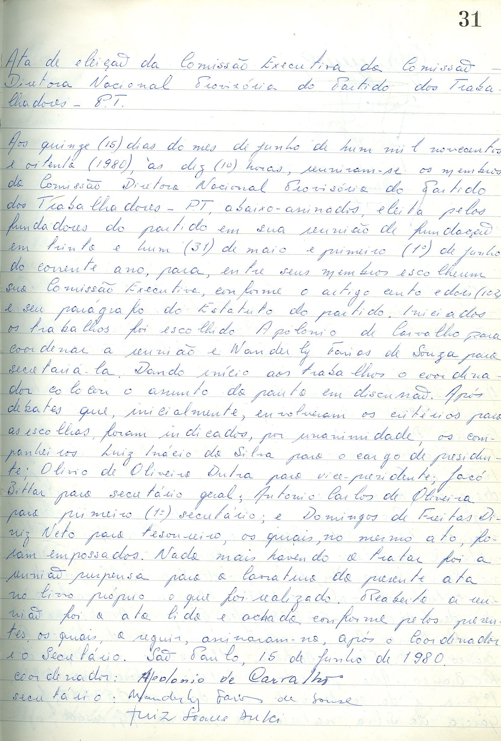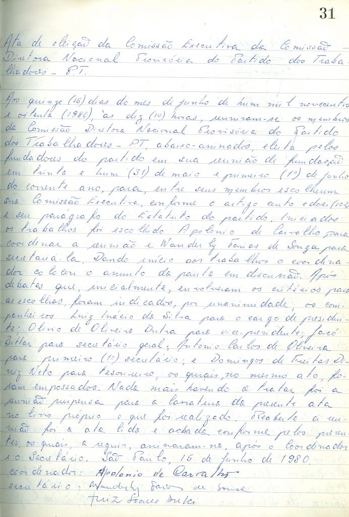 Ata de eleição da Comissão Executiva da Comissão Diretora Nacional Provisória do PT, São Paulo-SP, 15 de junho de 1980. Acervo: CSBH/FPA.
