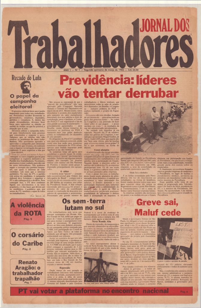 Capa da edição número 01 do Jornal dos Trabalhadores, de 1982. De periodicidade quinzenal, o jornal teve 21 edições, 1983. Acervo: CSBH/FPA.