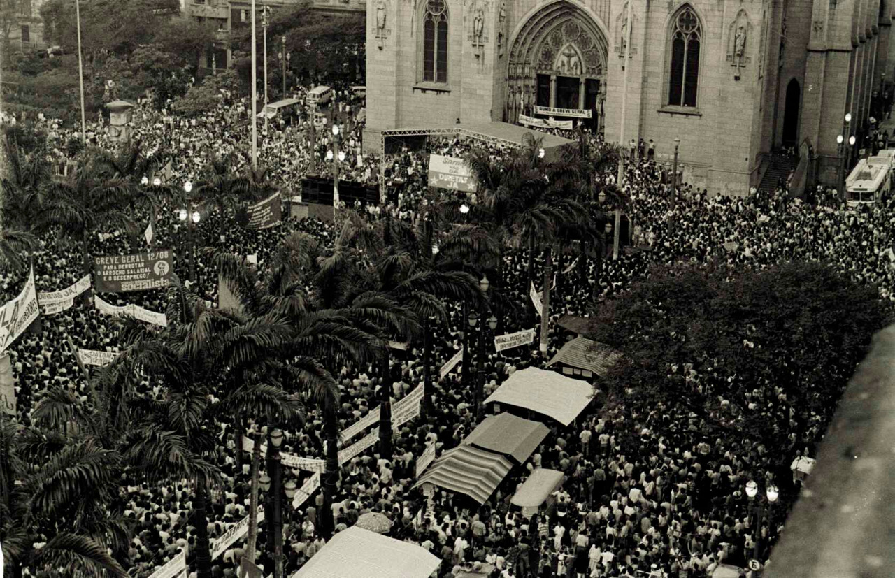 Ato contra a condenação dos sindicalistas do ABC pela Lei de Segurança Nacional, São Paulo-SP, 1981. Crédito: Vera Jursys. Acervo: CSBH/FPA.