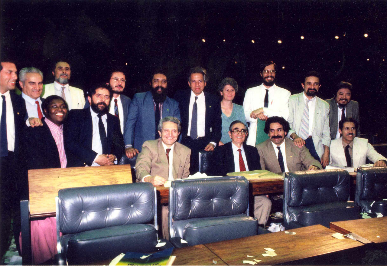 Bancada do PT na Assembleia Nacional Constituinte. Da esquerda para a direita: Sentados: Benedita Souza da Silva Santos (RJ); Luiz Inácio Lula da Silva (SP); Plínio Soares de Arruda Sampaio (SP); Florestan Fernandes (SP); Olívio de Oliveira Dutra (RS); Vitor Buaiz (ES). De pé: Virgílio Guimarães de Paula (MG); João Paulo Pires de Vasconcelos (MG); José Genoino Neto (SP); Paulo Gabriel Godinho Delgado (MG); Paulo Renato Paim (RS); Vladimir Gracindo Soares Palmeira (RJ); Irma Rosseto Passoni (SP); Eduardo Jorge Martins Alves Sobrinho (SP); Gumercindo de Souza Milhomem (SP); Luís Gushiken (SP), Brasília-DF, 1988. Crédito: Paula Simas. Acervo: CSBH/FPA.