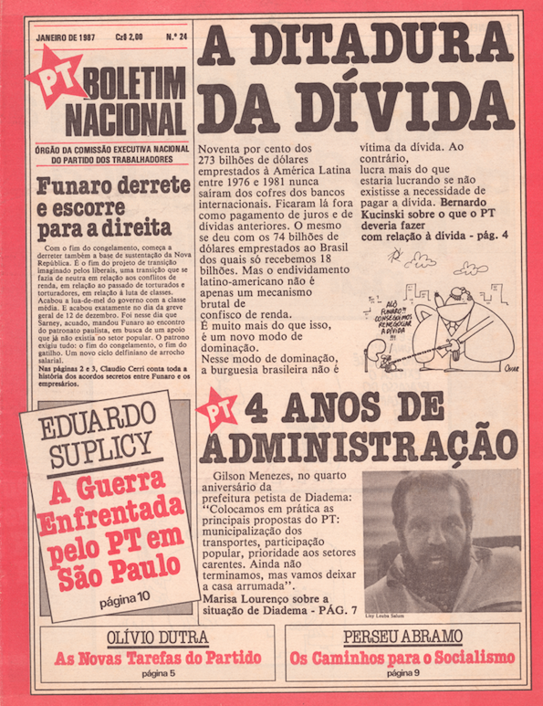 Capa da edição número 24 do Boletim Nacional do PT de 1987.O jornal era um órgão informativo da Comissão Executiva Nacional do PT. O primeiro número do periódico é de 1980 e o último, nº 91, de 1994. Acervo: CSBH/FPA.