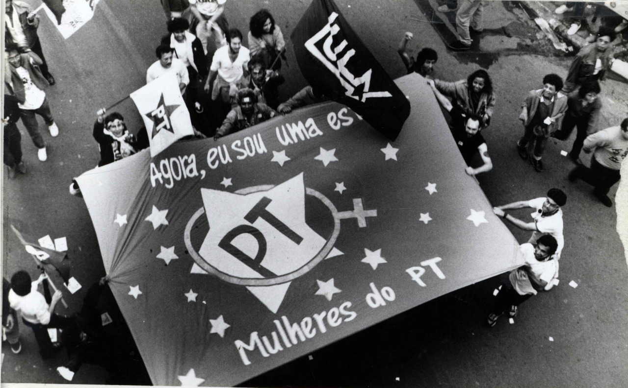 Bandeira das Mulheres do PT durante campanha “Lula Presidente”, 1989. Crédito: Vera Jursys. Acervo: CSBH/FPA.