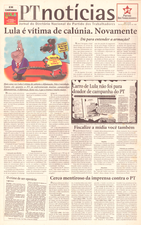 Capa da edição número 68 do PT Notícias, de 1998. O jornal era um órgão semanal do Diretório Nacional do PT. A primeira edição é de 1996 e sua última, nº 161, de 2005. Acervo: CSBH/FPA.