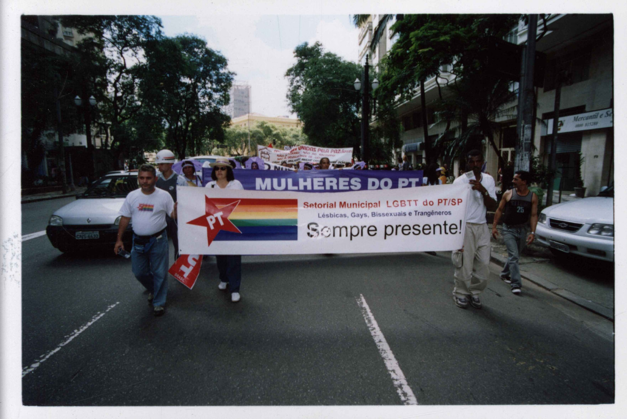 Setorial Municipal LGBTT do PT/SP durante ato realizado no centro da capital paulista, São Paulo-SP, [199-]. Crédito: Autoria desconhecida. Acervo: CSBH/FPA.