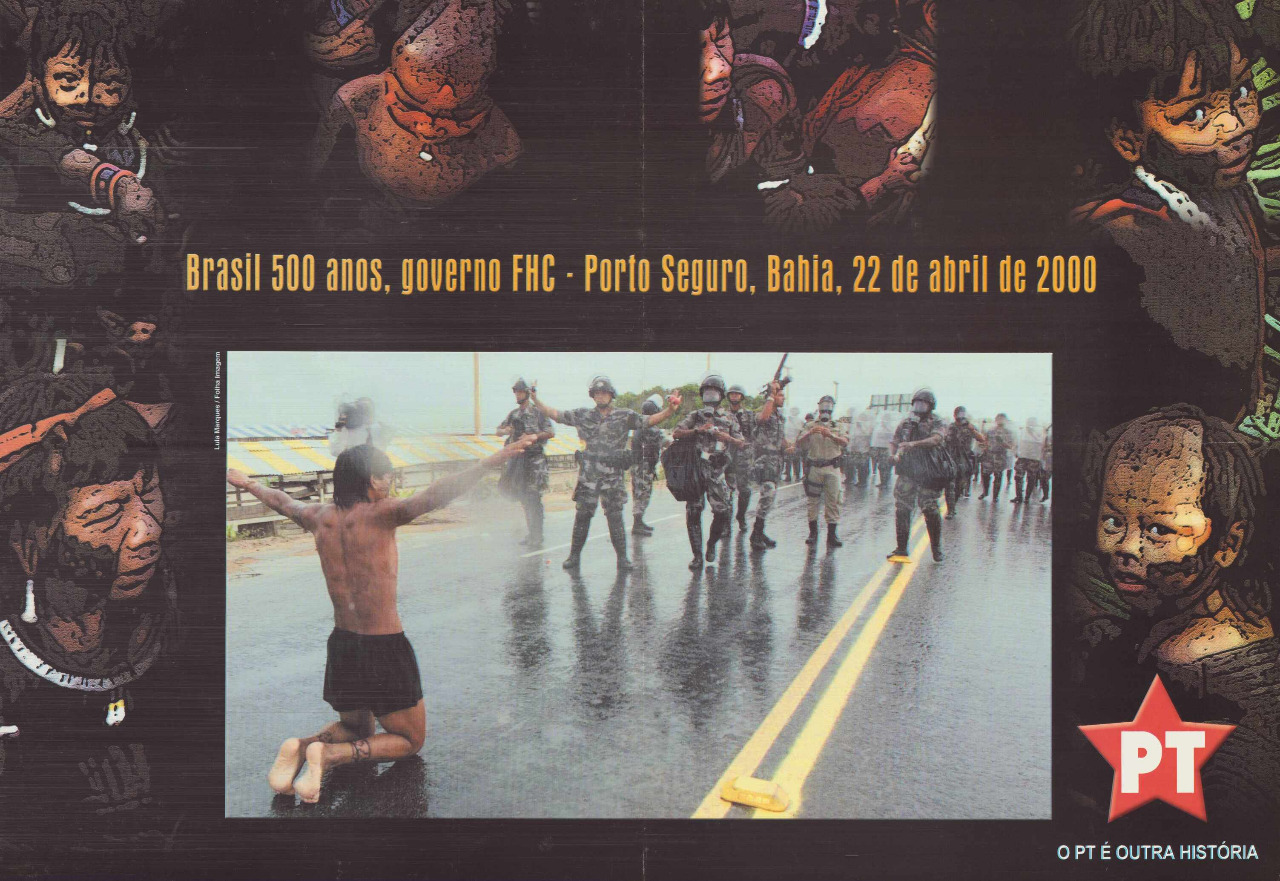 Cartaz retrata a repressão policial à marcha dos indígenas contra as comemorações oficiais dos 500 anos do “descobrimento” do Brasil, promovidas pelo governo FHC. O protesto foi parte da campanha “Brasil: outros 500. Resistência Indígena, Negra e Popular”, protagonizada por grupos indígenas, juntamente com o PT e outras organizações sociais, 2000. Acervo: CSBH/FPA.