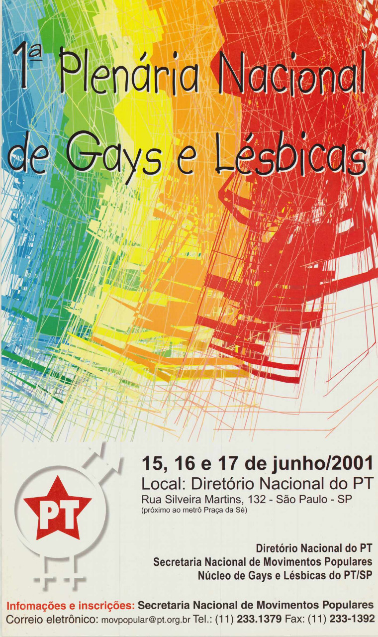 Cartaz da 1ª Plenária Nacional de Gays e Lésbicas do PT. Secretaria Nacional de Movimentos Populares, Núcleo de Gays e Lésbicas do PT/SP, 15 a 17 de junho de 2001, São Paulo-SP. Acervo: CSBH/FPA.