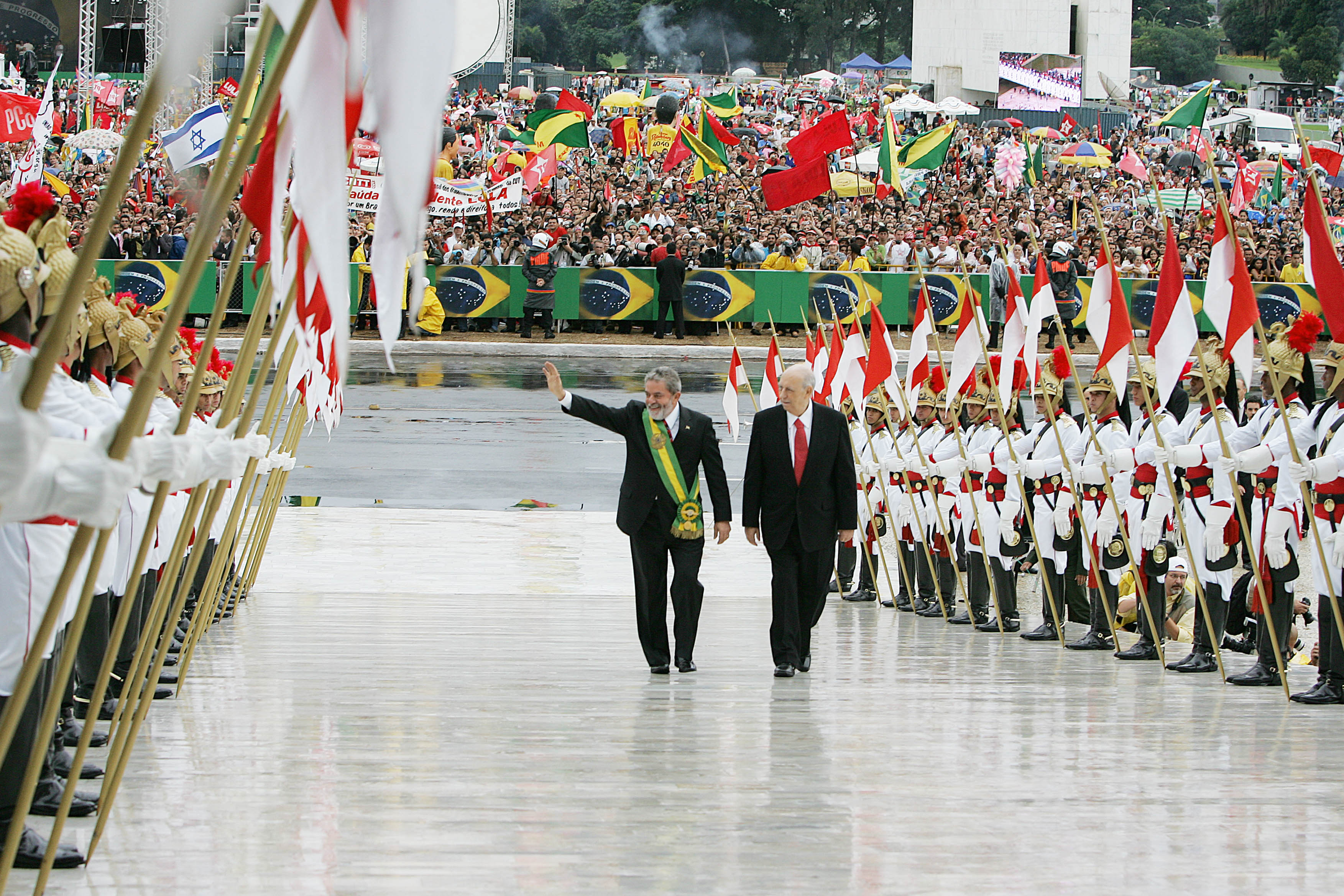 Lula na rampa do Palácio, acompanhado do vice José Alencar, na cerimônia de posse do segundo mandato como presidente, Brasília-DF, 01 janeiro de 2007. Crédito: Ricardo Stuckert Filho.