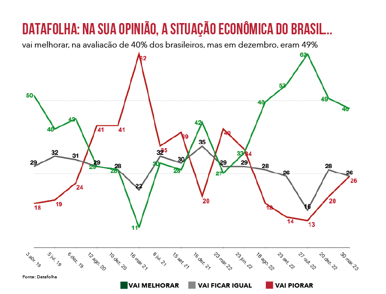 O Datafolha mediu as expectativas econômicas do povo brasileiro. Comparando com o levantamento de dezembro de 2022, é possível verificar variações nas projeções dos entrevistados sobre o futuro. A força do noticiário econômico provocou uma percepção de que a situação do país vai piorar, mesmo diante de indicadores mostrando agora o contrário.