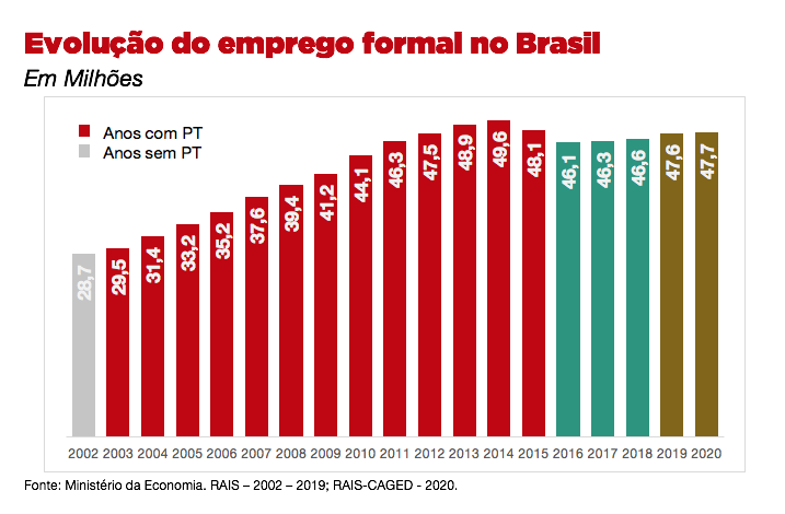 A partir de 2015, já sob as ações de inviabilização do governo Dilma, o emprego formal parou de crescer no país. Após a queda dela em 2016, permaneceu praticamente estagnado. E, em 2020, o total de empregos formais no Brasil permanecia inferior a 2015.