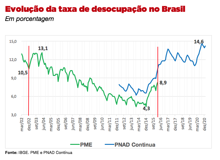 Outro aspecto da deterioração do mercado de trabalho brasileiro é a taxa de desocupação, que explodiu no pós-golpe. Após ter atingido os menores patamares históricos em 2013 e 2014, esta taxa atingiu dois dígitos em 2016 e nunca mais decresceu. Em 2020, havia 13,4 milhões de pessoas desocupadas. Comparado com 2014, ano com os menores níveis de desocupação (6,7 milhões de pessoas), o crescimento foi de 100%. A taxa de desemprego foi de 14,7% no primeiro trimestre de 2021, recorde da série histórica, iniciada em 2012, segundo o IBGE.