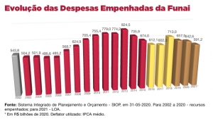 Se não conseguiu promover as alterações executivas que pretendia, Bolsonaro deu sequência à política de sufocamento orçamentário da Funai. Em quase todos os anos após o golpe, exceto em 2018, os recursos do órgão foram inferiores ao total empenhado em 2015. Em valores reais, o orçamento aprovado para 2021 é 12% menor que em 2015.