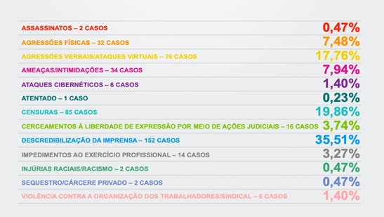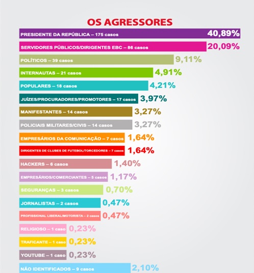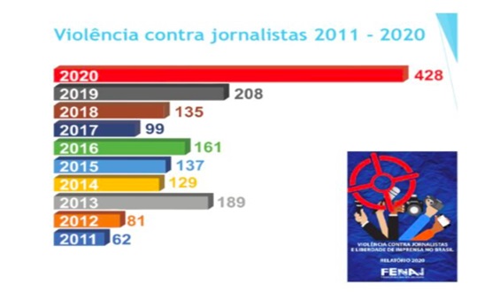 O presidente junto aos servidores públicos e dirigentes da EBC, recursos humanos do Gabinete do Ódio, respondem por mais de 60% das agressões. A FENAJ ressalta que os dois assassinatos em 2020, repetindo o número de 2019 é um alerta de grave insegurança para a categoria.