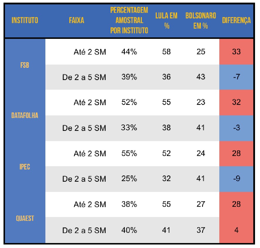 No quadro abaixo, propomos uma reflexão. Mostramos as últimas pesquisas dos principais institutos com o desenho amostral por renda e a intenção de voto nos candidatos à Presidência. Na última coluna, somamos a diferença entre intenção de voto no Lula e no Bolsonaro. Em vermelho com números positivos, os segmentos que Lula venceria. Em azul, com números negativos, os segmentos que dão vantagem a Bolsonaro.