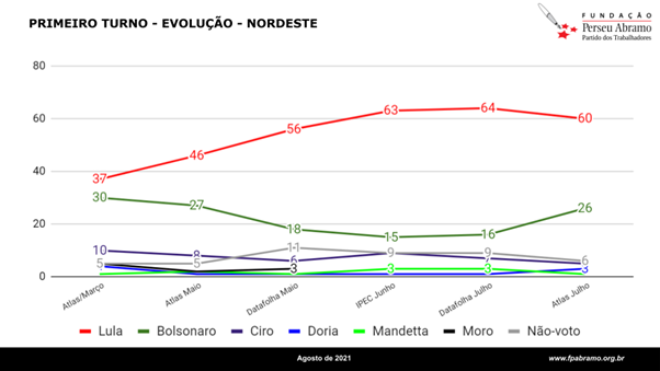 É evidente a associação entre a alta reprovação a Bolsonaro (sem partido) e a intenção de voto em Lula (PT) no Nordeste. A região já oferecia os maiores índices de reprovação ao governo mesmo antes da pandemia, e hoje é majoritário o sentimento de que o governo Bolsonaro é ruim ou péssimo: mais de 60%, segundo Datafolha, Atlas e Poderdata, e 56% para o instituto Quaest.