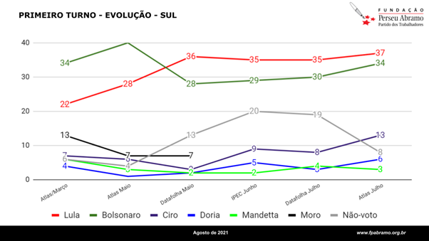 Na região Sul, terceira maior em número de eleitores (cerca de 20 milhões, quase 15% do total), a disputa parece ser mais parelha: o Datafolha mostra que, no primeiro turno, Lula teria 35% contra 30% do atual presidente; na pesquisa Atlas, seriam 37% para o ex-presidente Lula e 34% para o atual. Tal qual no Sudeste, a aprovação ao governo atingiu cerca de 30%, o que se traduz em patamar semelhante de intenção de votos para Bolsonaro. É nesta região que o desempenho de Lula em primeiro turno possui patamares mais baixos, de acordo com os diversos institutos.