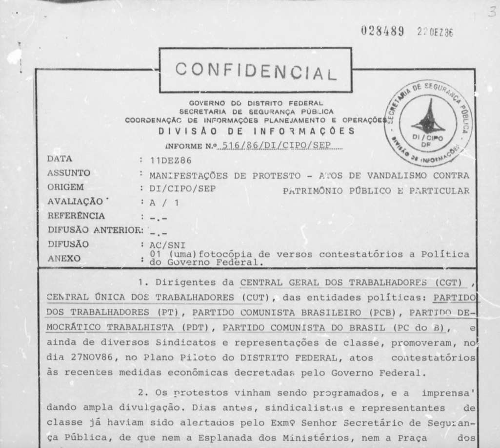 O relatório confidencial Apreciação 004/120/AC/87, produzido pela Agência Central do Serviço Nacional de Informações (SNI), em 3 de fevereiro de 1987, traz a relação dos manifestantes que participaram dos protestos de 27 de novembro de 1986 e uma lista com os presos nos atos da Greve Geral realizada em 12 de dezembro. O documento menciona as organizações troquiskistas brasileiras (“OTB”) e outras organizações comunistas (“OC”), “que atuam encasteladas no PT” — responsabilizado juntamente com a CUT diretamente pela violência ocorrida naqueles dois eventos.