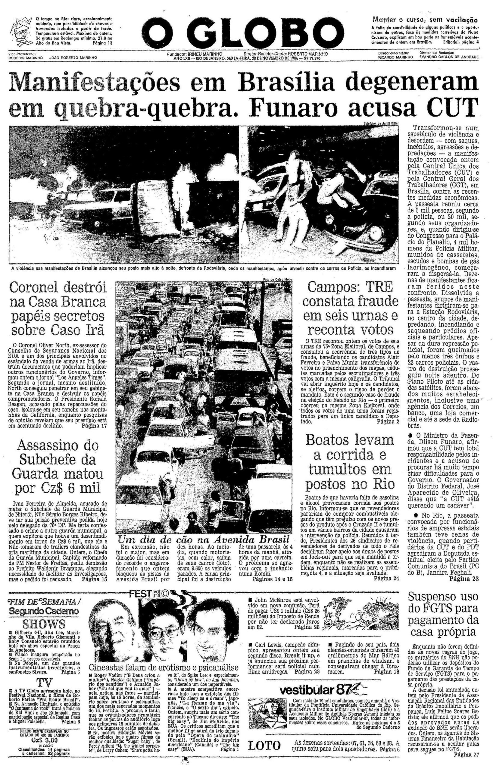 Em 27 de novembro de 1986, Brasília viveu o seu primeiro grande protesto pós-ditadura, nos extertores do velho regime, no que era a alvorada da Nova República, sem Tancredo Neves, mas na esperança de dias melhores. O presidente José Sarney havia acabado de baixar o Cruzado 2, depois do PMDB sair vitorioso em 26 estrados, no que pareceu ser o primeiro grande estelionato eleitoral da segunda metade do século 20.