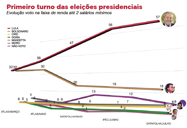 Neste caso, é possível também afirmar que, além de reprovarem o governo, os brasileiros de menor renda tem uma fortíssima tendência de votar em Lula nas eleições presidenciais de 2022. O ex-presidente lidera com muita folga já no primeiro turno, com um desempenho muito mais fraco de Bolsonaro. Há, praticamente, uma sobreposição entre o número de brasileiros desta faixa de renda que declaram voto em Lula e que reprovam Bolsonaro. Os números são de 57% e 54%, respectivamente, segundo o Datafolha. Desde que Lula tornou-se elegível, há evidente aumento paulatino da intenção de voto neste segmento.
