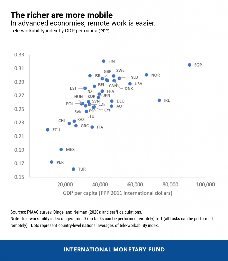 Encontramos diferenças consideráveis entre os países, mesmo dentro das mesmas ocupações. É bem mais fácil teletrabalhar na Noruega e Singapura do que na Turquia, Chile, México, Equador e Peru, simplesmente porque mais da metade dos lares na maioria dos países em desenvolvimento e de mercados emergentes não tem sequer um computador em casa.