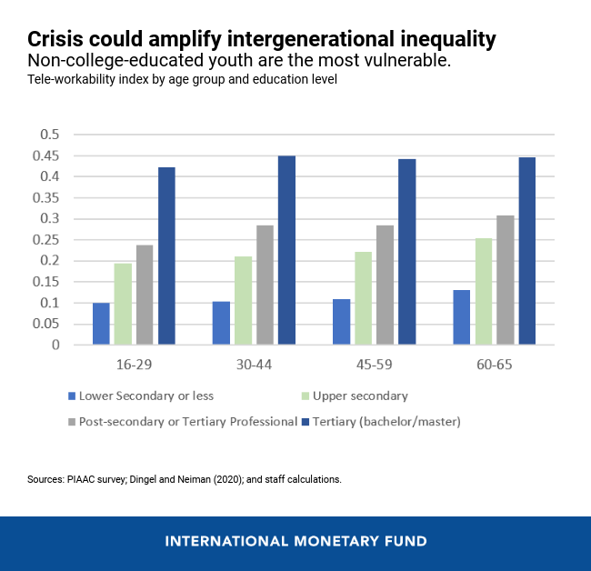 Os jovens trabalhadores e aqueles sem formação universitária têm uma probabilidade bem menor de trabalhar a distância. Este risco maior se encaixa nos perfis etários dos trabalhadores dos setores mais atingidos pelas medidas de confinamento e políticas de distanciamento social. É um dado preocupante, pois indica que a crise pode ampliar a desigualdade intergeracional .