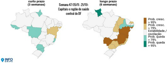 Em apenas 6 das 27 unidades federativas observa-se tendência de longo e curto prazo com sinal de queda ou estabilização em todas as respectivas macrorregiões de saúde. Nos demais 21 estados, que são Acre, Pará, Tocantins, Alagoas, Bahia, Ceará, Maranhão, Paraíba, Piauí, Rio Grande do Norte, Sergipe, Espírito Santo, Minas Gerais, Rio de Janeiro, São Paulo, Paraná, Rio Grande do Sul, Santa Catarina, Goiás, Mato Grosso e Mato Grosso do Sul, há ao menos uma macrorregião estadual com tendência de curto e/ou longo prazo com sinal moderado (probabilidade > 75%) ou forte (probabilidade > 95%) de crescimento.