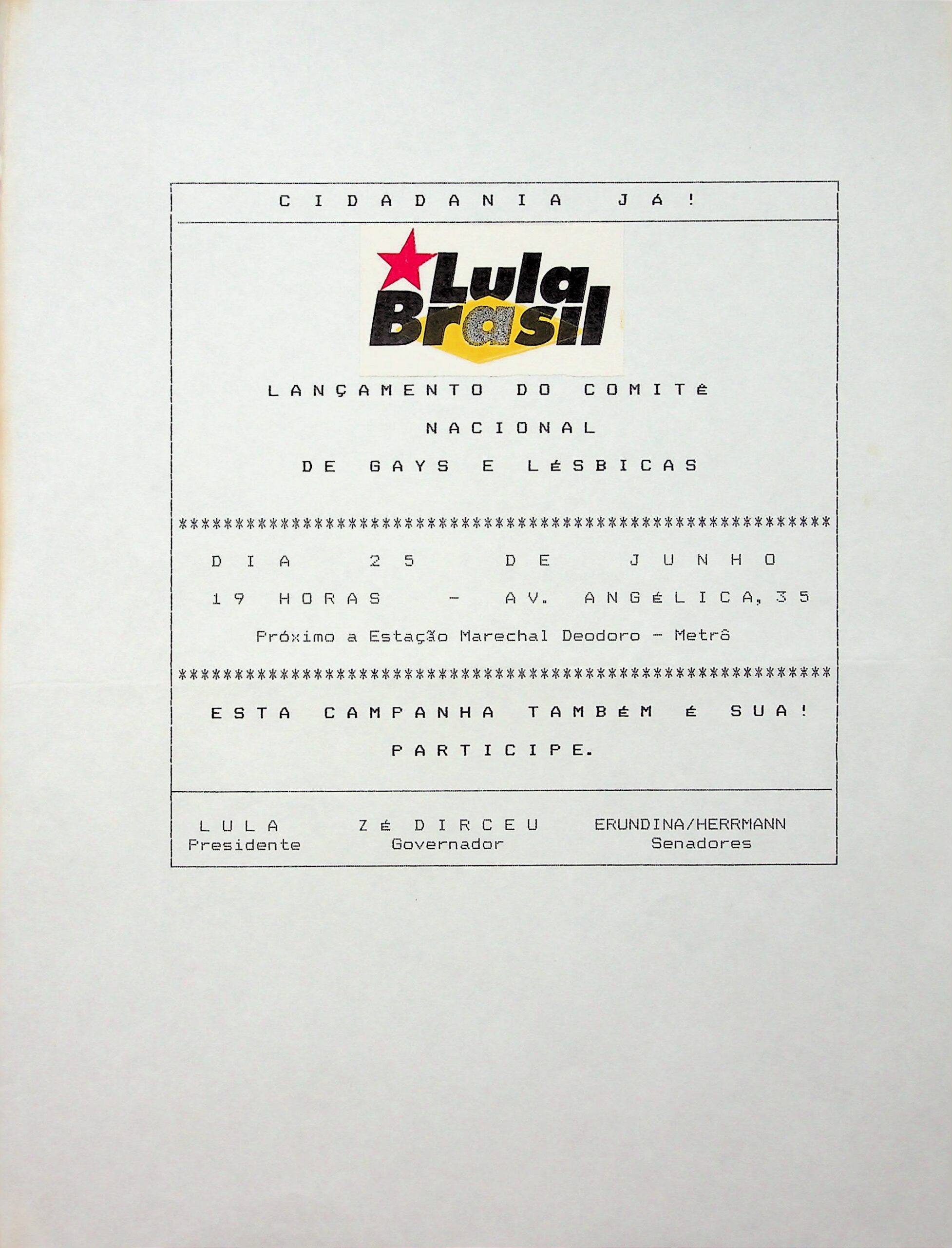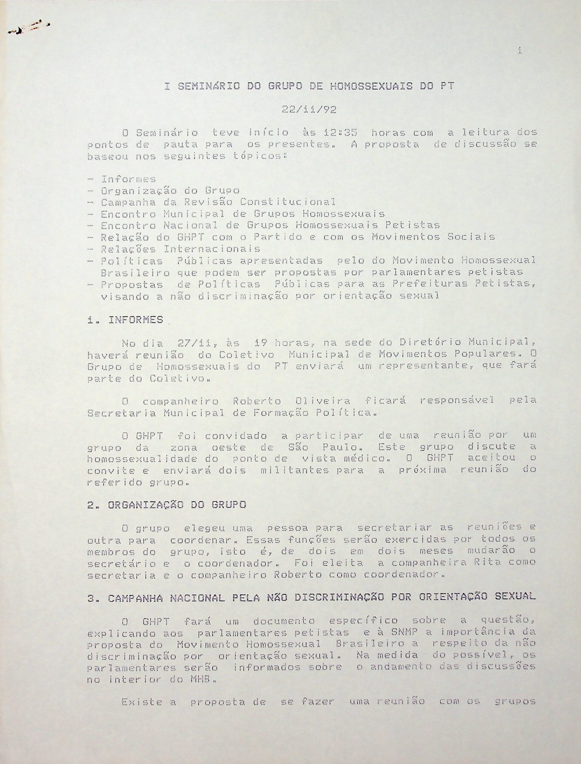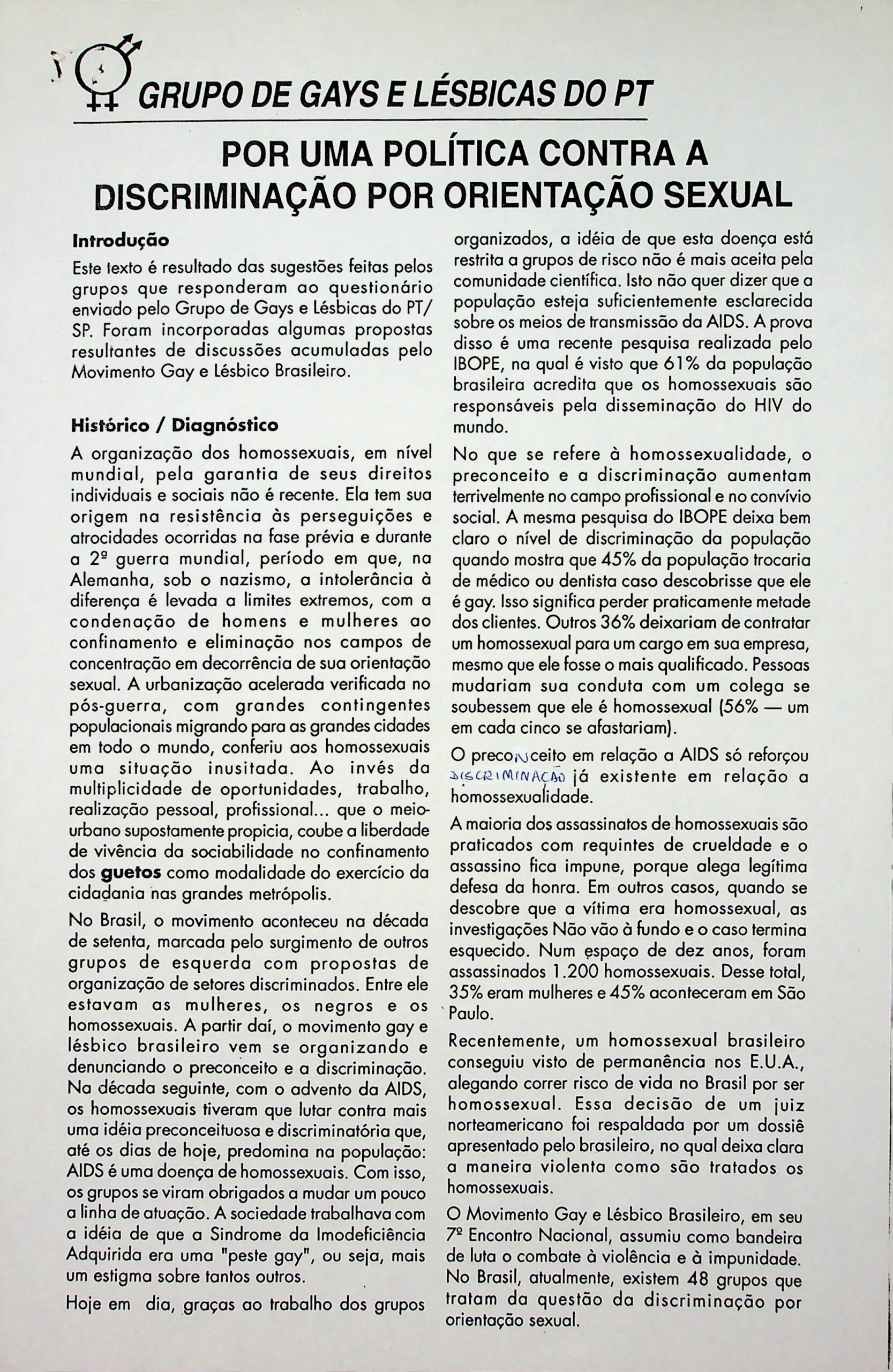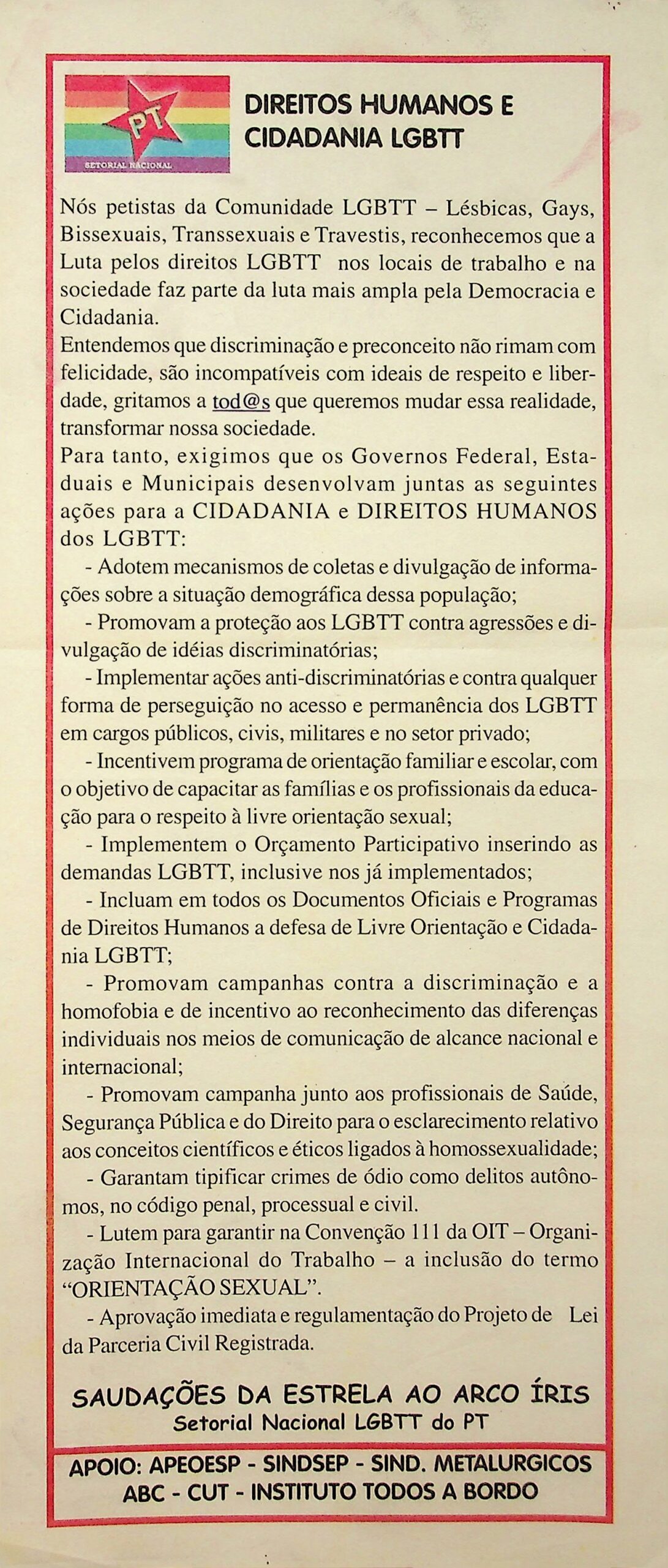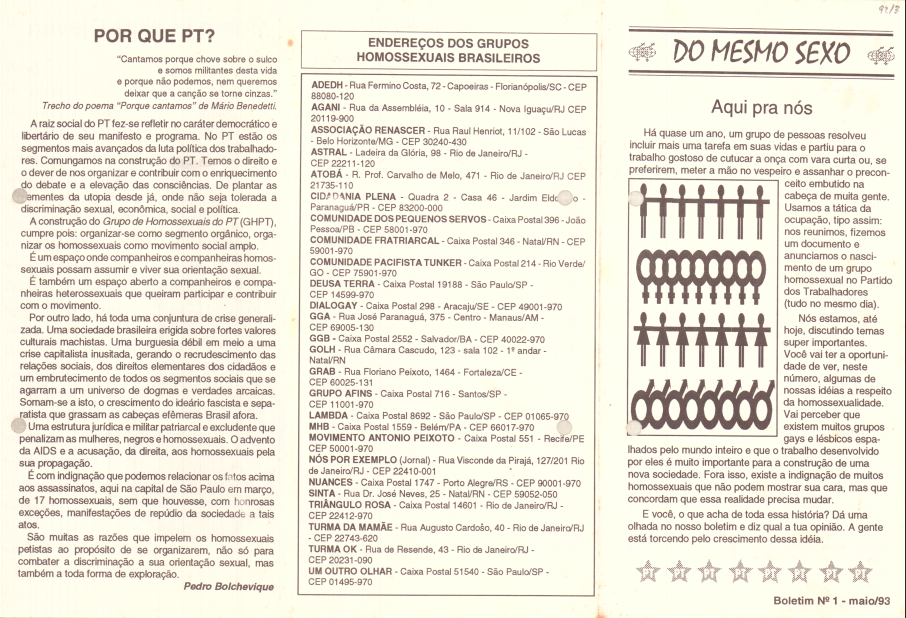 Os documentos abaixo estão disponíveis no acervo do Centro de Documentação e Memória Política Sérgio Buarque de Holanda. Foram digitalizados para compor uma amostragem do que temos para consulta em nosso acervo físico da Secretaria Nacional LGBT.